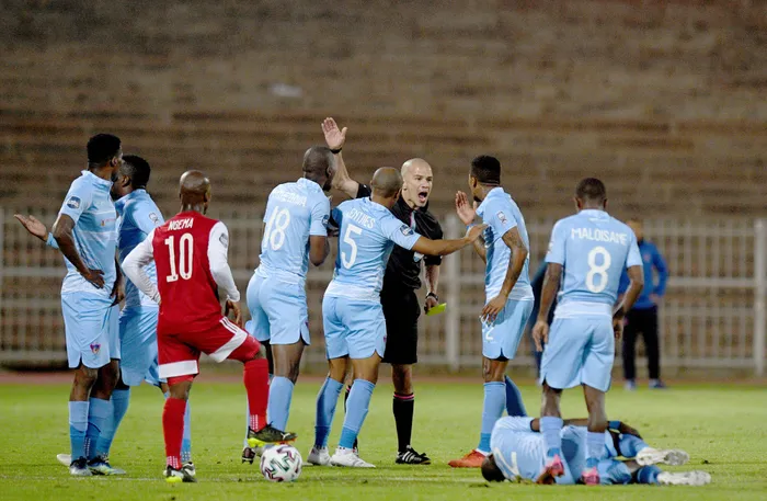 Umdlali weChippa United, u-Oupa Manyisa, uwiswe phantsi emdlalweni weDStv Premiership izolo. Umfanekiso:Sydney Mahlangu/BackpagePix