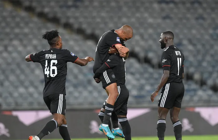 Abadlali bevuyisana noGoodman Mosele ofake igowuli ephumelele ngalo i-Orlando Pirates ebethe iSuperSport United emdlalweni weDStv Premiership izolo. Umfanekiso: Sydney Mahlangu/BackpagePix