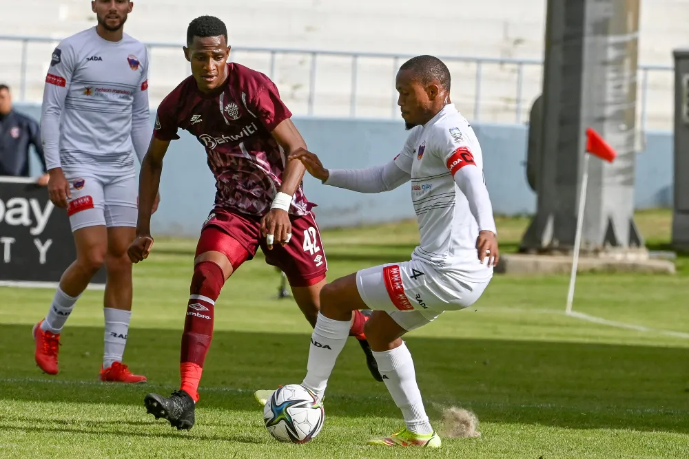 ULehlogonolo Matlou weMaroko Swallows noRiaan Hanamub weChippa United emdlalweni weDStv Premiership obuseSisa Dukashe Stadium kunyaka ophelileyo. Umfanekiso: Deryck Foster/BackpagePix