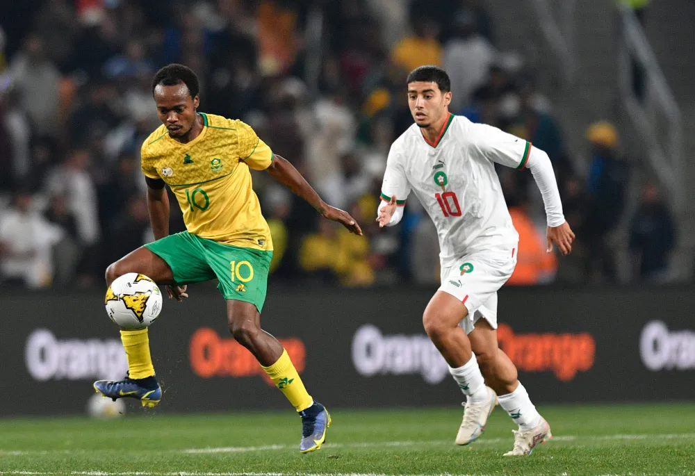 UPercy Tau weSouth Africa naye uAnass Zaroury weMorocco emdlalweni obuseFNB Stadium. Umfanekiso: ©Sydney Mahlangu/BackpagePix