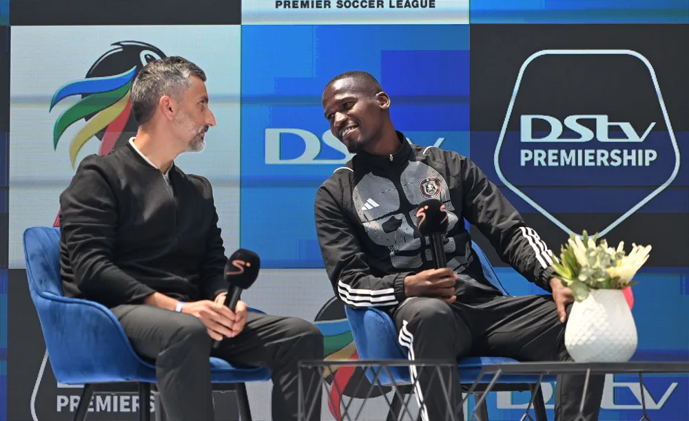 UJose Riveiro noTapelo Xoki be’Orlando Pirates bethetha neentatheli kwaMultiChoice. Umfanekiso ©Sydney Mahlangu/BackpagePix