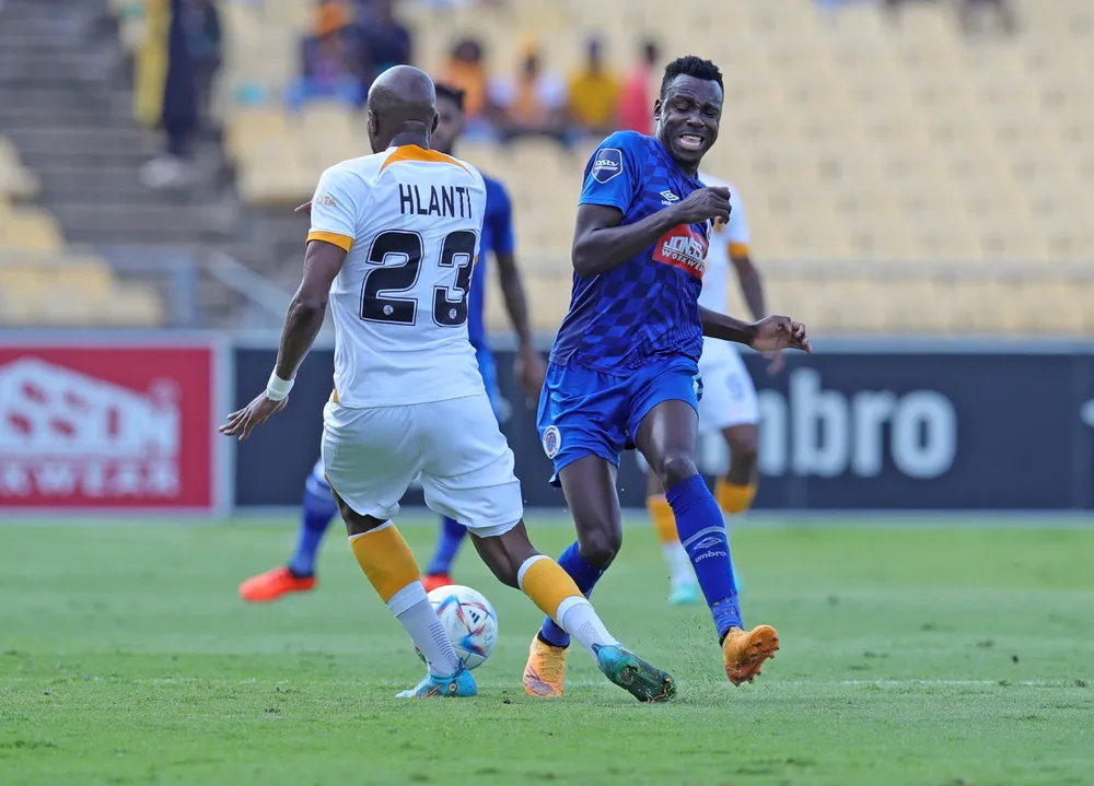 UGamphani Lungu weSupersport United noSfiso Hlanti weKaizer Chiefs besilwela ibhola emdlalweni weDStv Premiership kunyaka ophelileyo eRoyal Bafokeng Stadium. Umfanekiso: ©Samuel Shivambu/BackpagePix