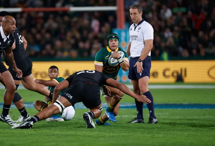 UCheslin Kolbe weSpringbok ejongene noSamipeni Finau weNew Zealand emdlalweni weRugby Championship obuse-Ellis Park, eGoli. Umfanekiso: @Gavin Barker/BackpagePix