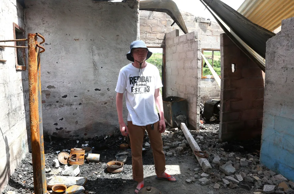 I' solezwe lesiXhosa lifike okaNtlanganiso ephelele kwezo zisesiqwini iimpahla nathi uziphiwe, yona indlu sele kushiyeke uthuthu lweempahla zangaphakathi. Uthi akakhuphanga nenye into ngaphakathi endlini kamamakhe. Umlenze wakhe wasekunene utshile nawo ngethuba ezama ukubaleka.
