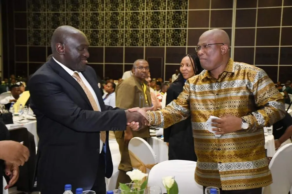 Inkulubaphathiswa ephondo uOscar Lubabalo Mabuyane evuyisana noMphathiswa wezeMfundo uFundile Gade eICC eMonti ngethuba kuwongwa abafundi abaphumelele emagqabini. UMFANEKISO: ANDILE NDUNA/ECPL