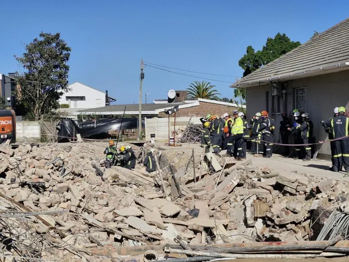 Amaqela okukhangela nokuhlangula asebenza ukufumana amaxhoba kwingqushu yokudilika kwesakhiwo eGeorge. UMFANEKISO: HERMAN PIETERS/GARDEN ROUTE MUNICIPALITY