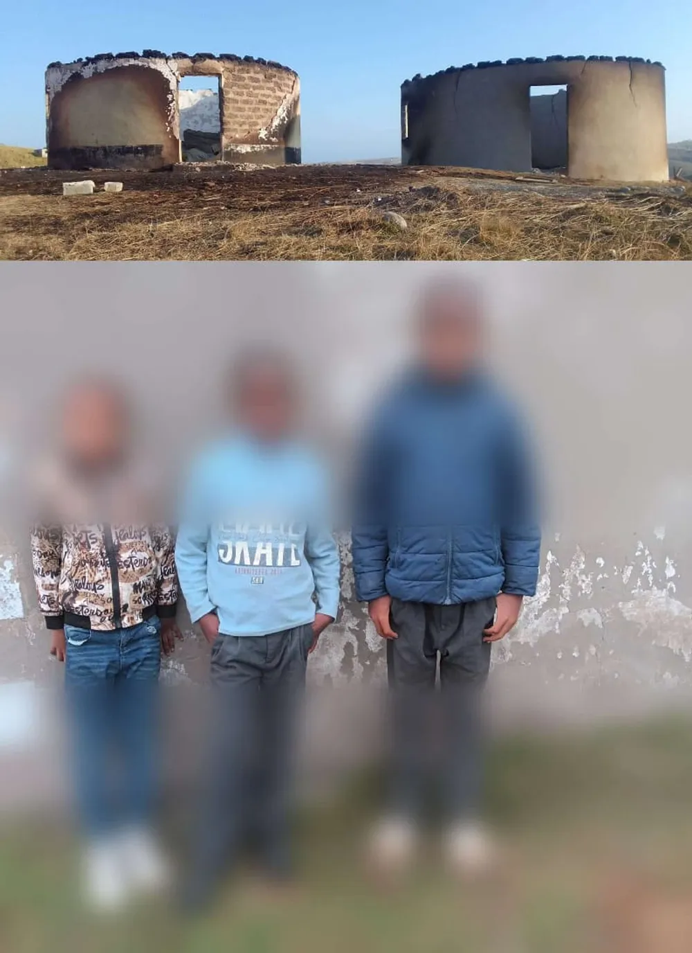 Umzi wakwaSidiki kuMpame eXhorha otshe ngumlilo obusuka emadlelweni, bashiyeke nezo zisesiqwini iimpahla. Ngezantsi ngabazukulwana abathathu abacelelwa iimpahla noba zezo zingasanxitywayo. UMFANEKISO: Khula Community Development Project EC.